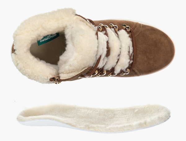 Съемная ортопедическая стелька с супинатором с покрытием из натуральной шерсти поддерживает своды стопы и распределяет нагрузку на суставы.