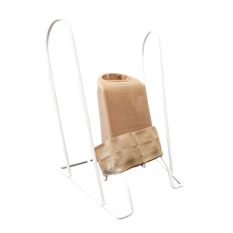 - Держась за высокие металлические дуги, поставьте носок стопы в «карман» и продвигайте ее вперед, постепенно надевая трикотаж. В процессе надевания следите за тем, чтобы пяточная часть изделия находилась на пятке.